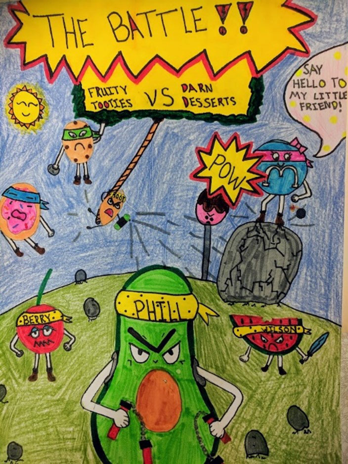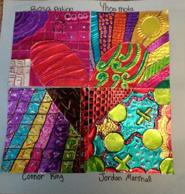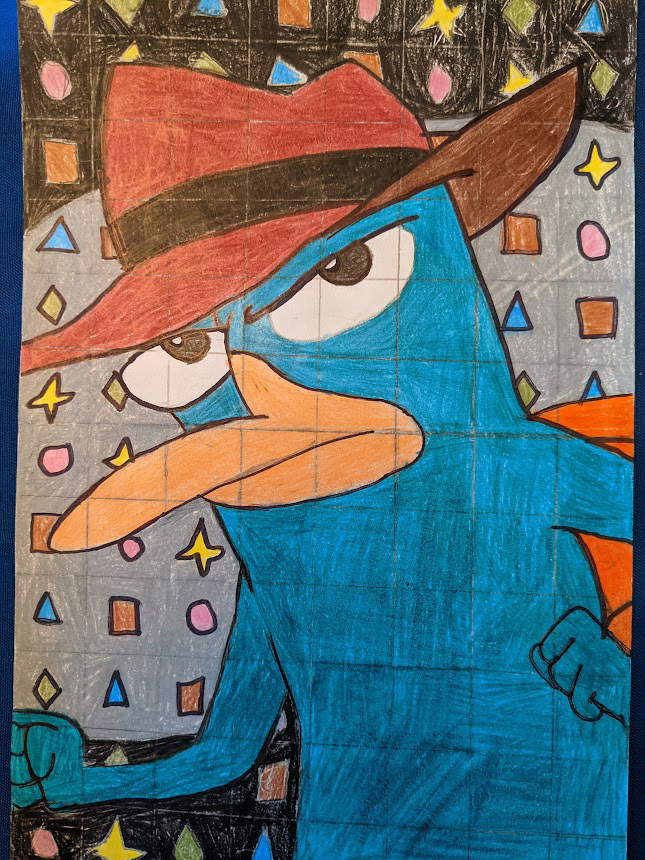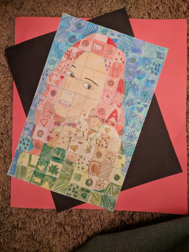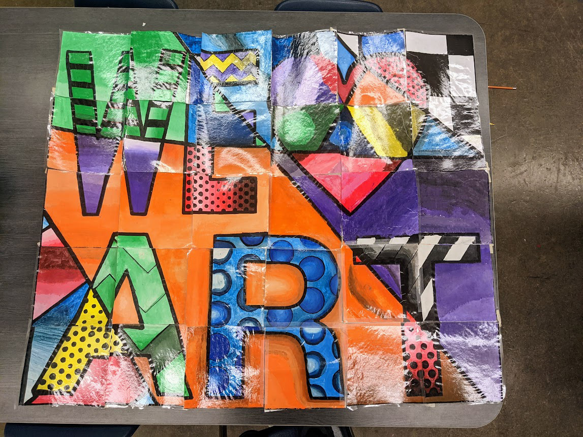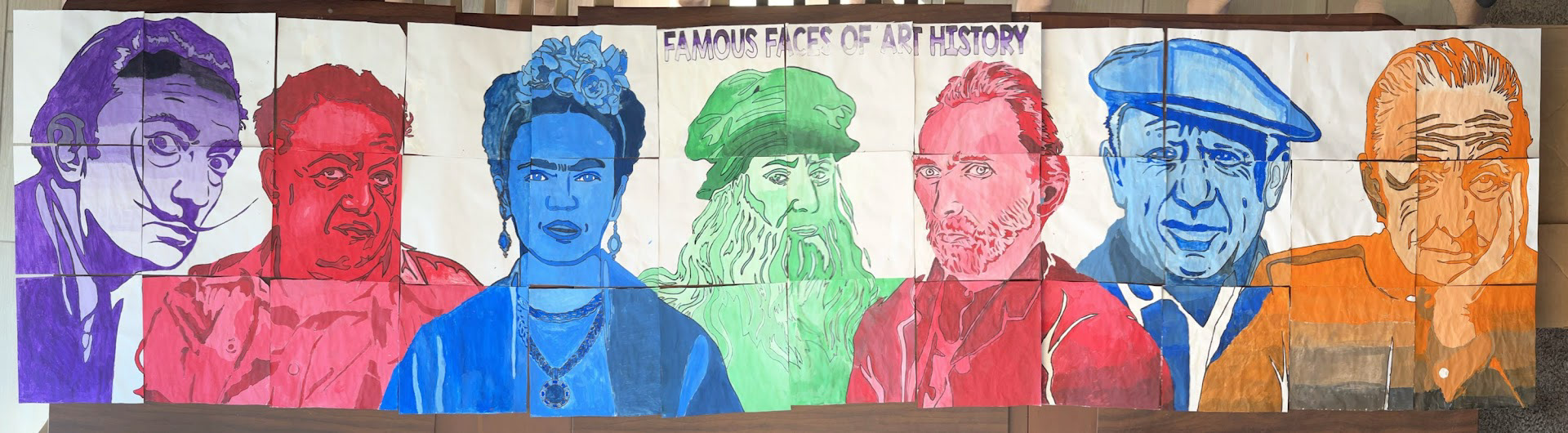 The advanced drawing and painting class created their own custom design to make a 10-foot (3 meter) long mural. Each letter represented a different facet of our school community.
