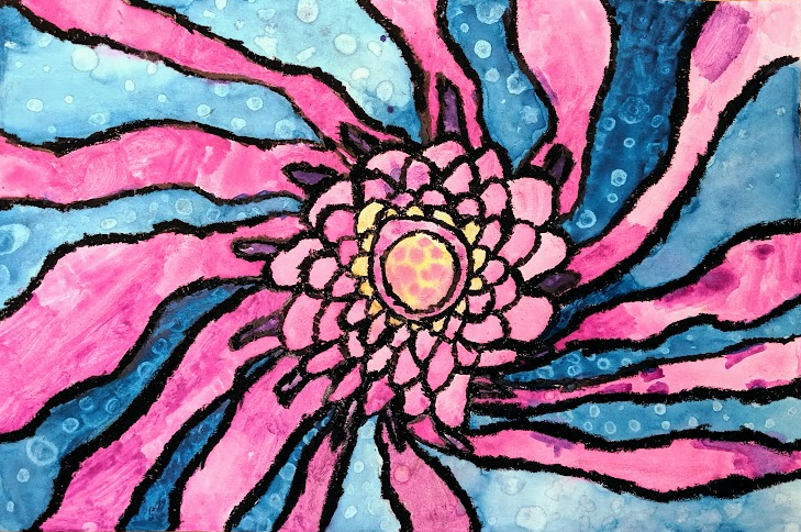 Abstraction, Scale, Watercolor techniques: wash, wet on wet, dry brush, dabbing, salt, and rubbing alcohol