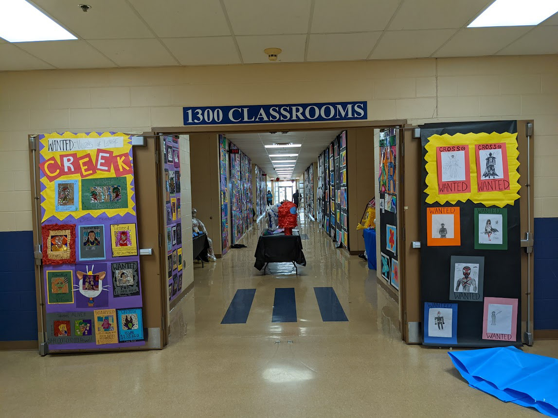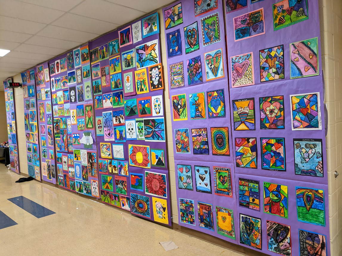 This video features the middle school set up from the 2022 exhibition, which was superhero/villain themed. I collaborated with my counterpart at the sister middle school in our district to plan and install this hallway to represent both schools. My students' artwork is hung primarily on the purple-backed panels.